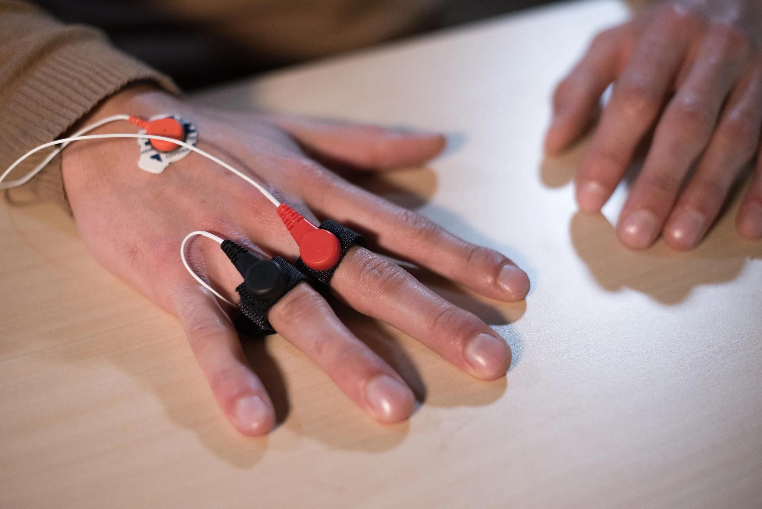 GSR 测量的常规操作方式是,将两个可重复使用的电极贴在一只手的两根手指上。我们提供的 GSR 传感器可连接至 SAGA 系统的任意一个辅助(AUX)通道。