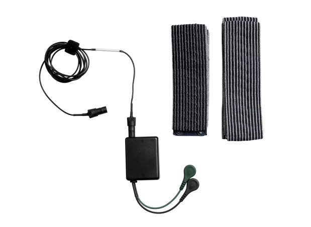 RespiV6 呼吸传感器可连接至 SAGA 系统的任意一个辅助(AUX)接口,由传感器模块和呼吸带两部分组成。使用时,通常将呼吸带环绕在胸部或腹部,以捕捉胸式呼吸和腹式呼吸的节律。